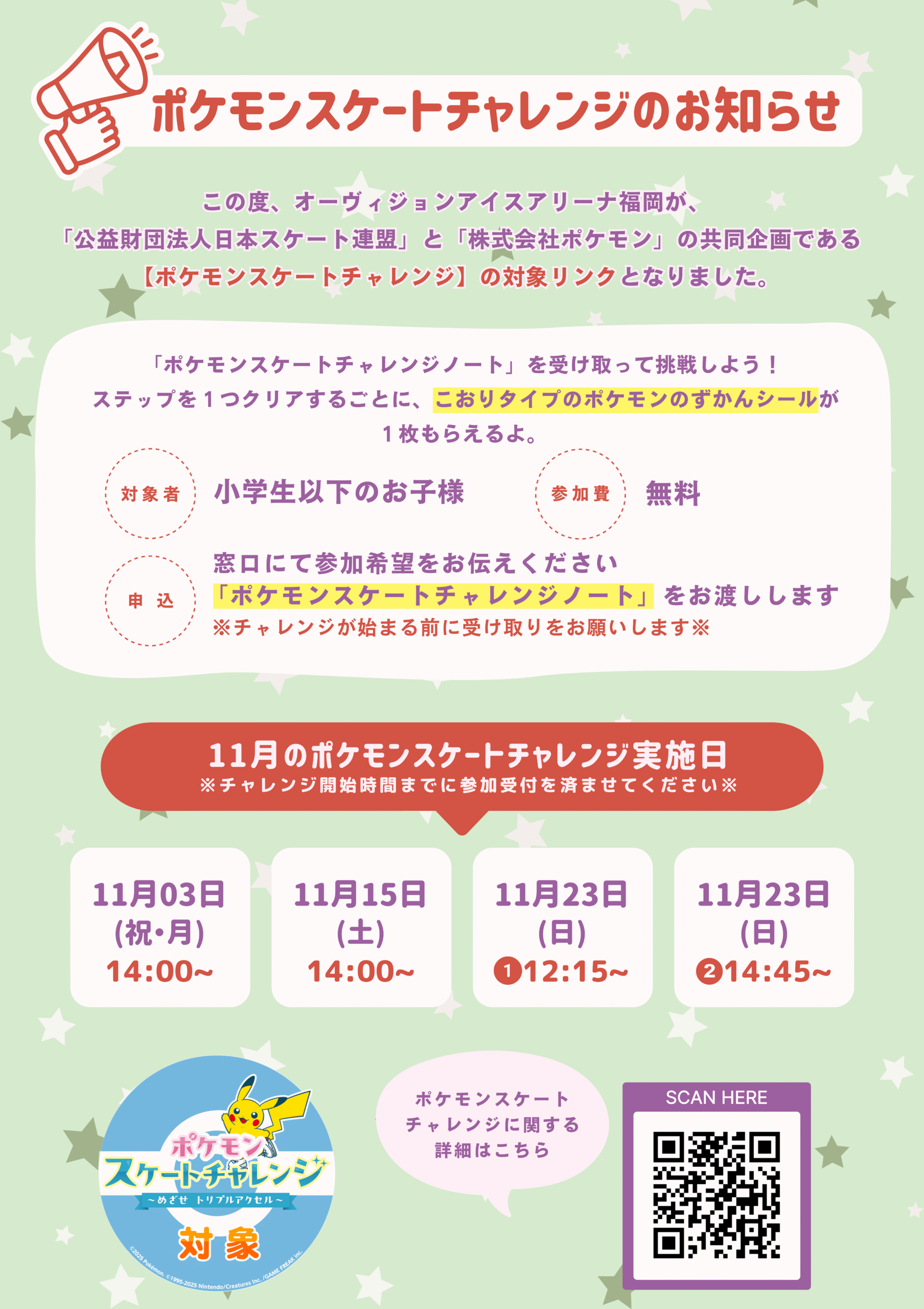 11月の一般営業時間内に開催する、ポケモンスケートチャレンジの日程をお知らせいたします✨