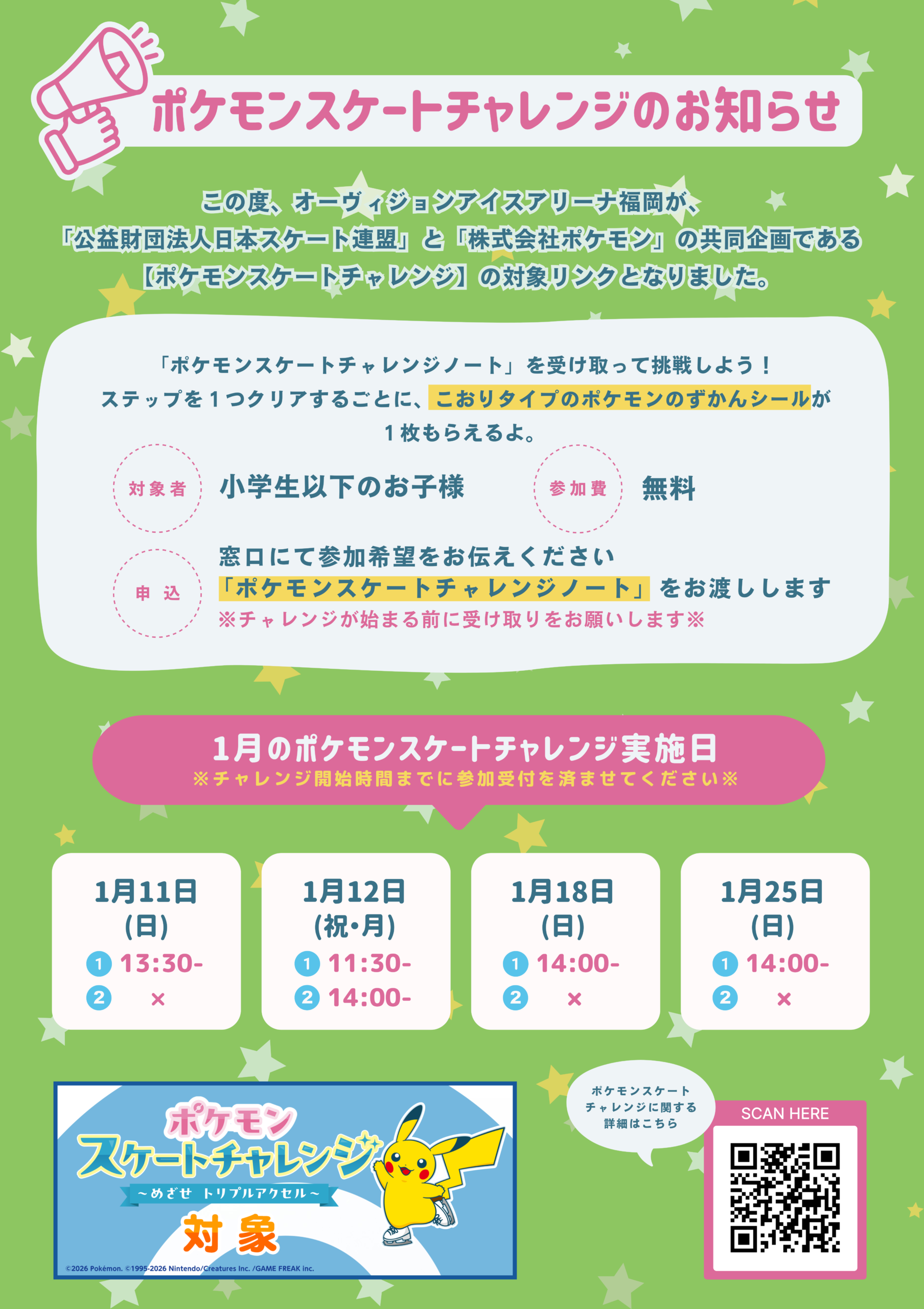 1月の一般営業時間内に開催する、ポケモンスケートチャレンジの日程をお知らせいたします✨