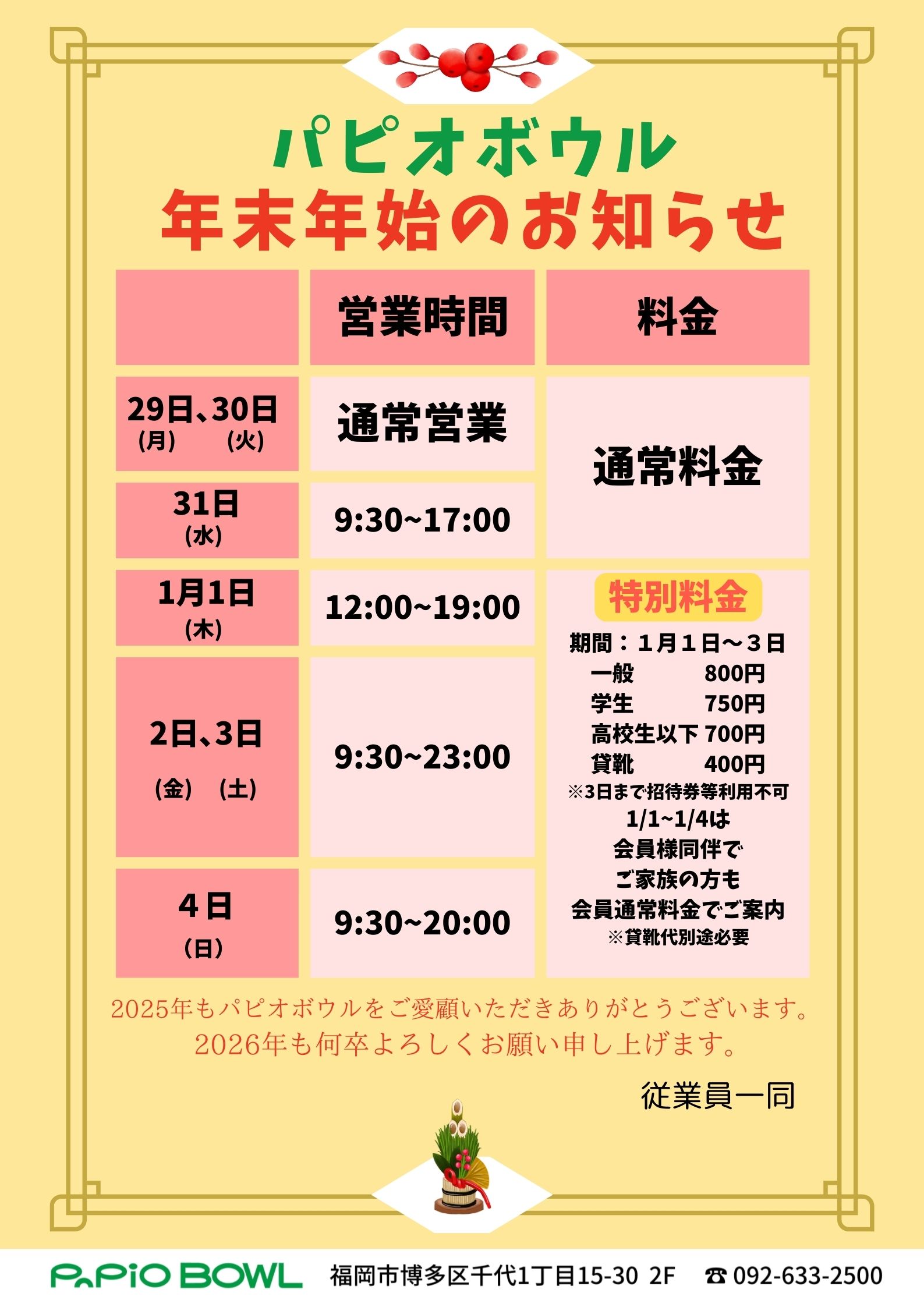パピオボウル年末年始営業時間および正月特別料金のご案内