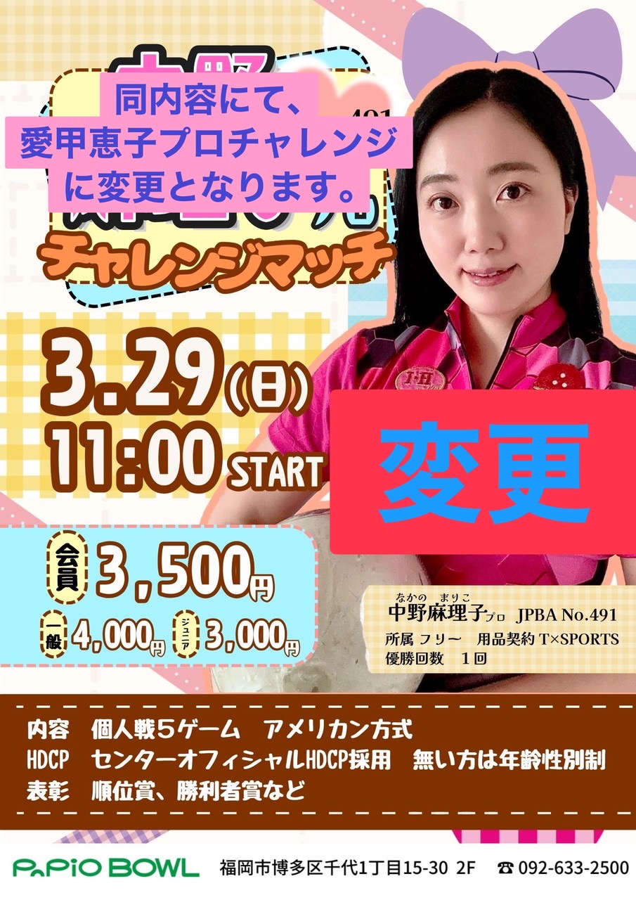 3月29日(日) プロチャレンジマッチ プロボウラー変更のお知らせ